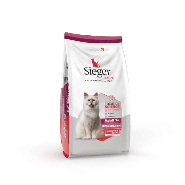 Sieger Katze Adult 7+ Resveratrol colabora en ralentizar los signos del envejecimiento y ayuda a mejorar la actividad y calidad de vida en la segunda etapa de la adultez. Diseñado para promover el correcto funcionamiento renal, fundamental en esta etapa de la vida.