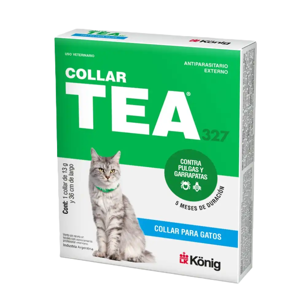 TEA 327 COLLAR, es un collar de matriz plástica pulguicida y piojicida para perros y gatos que protege a tu mascota durante 5 meses de todo tipo de parásitos externos, actuando también como garrapaticida en caninos. La exclusiva matriz plástica de TEA 327 COLLAR está saturada de micropartículas insecticidas que son liberadas de forma contínua, esparciéndose sobre el cuerpo del animal y logrando una protección eficaz las 24 horas del día.